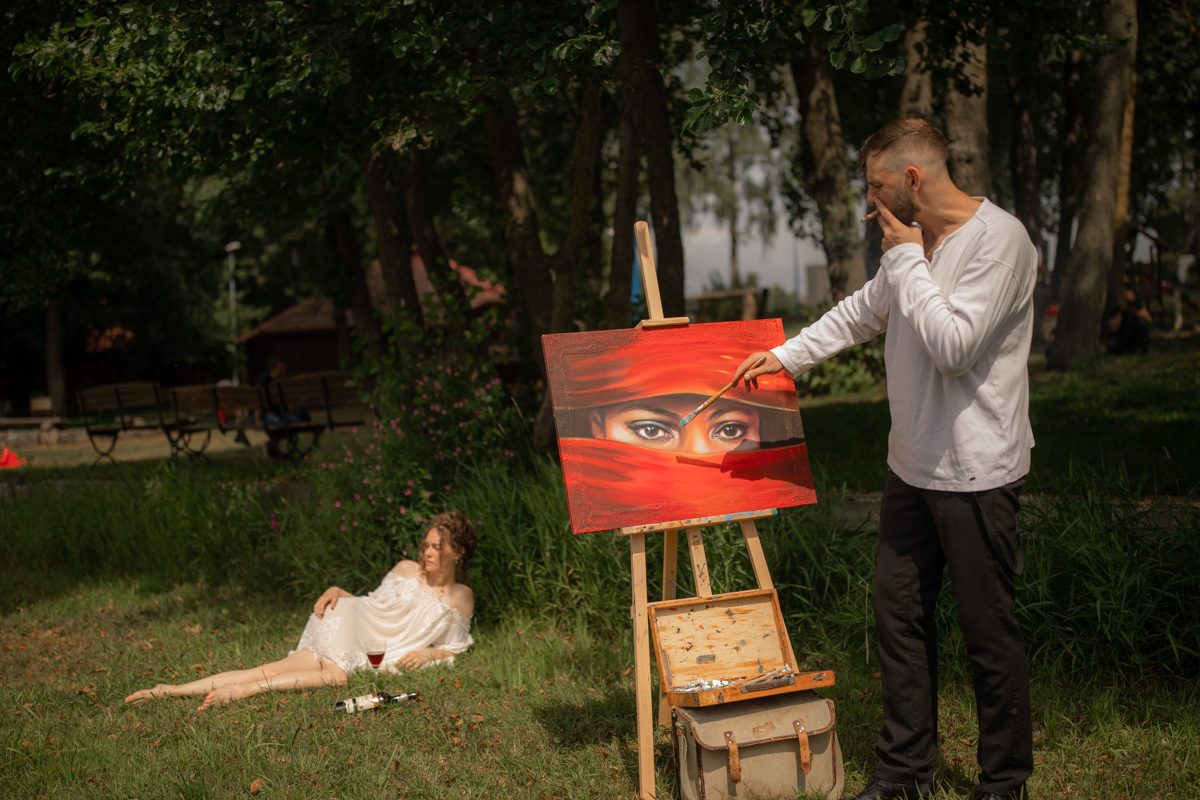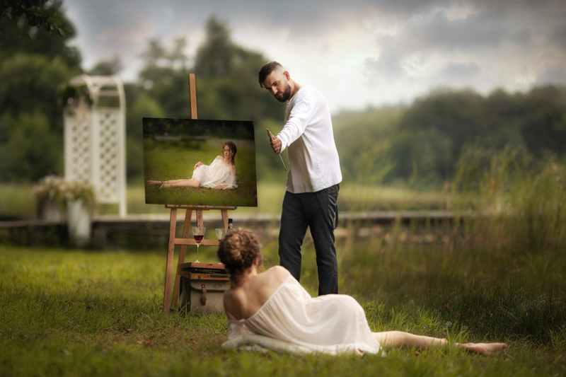 Do mojej wizji tego pleneru potrzebny był model i jak to u nas często bywa, model po prostu się pojawił. Od jednego przypadkowego spotkania, poprzez sesję do kolejnego i tak na naszych kadrach pojawił się Jacek. Modelkami były prześliczne dwie Pauliny i Alona. Wizja głównego kadru byłaby niemożliwa, a w każdym razie mocno niedopracowana z nowymi sztalugami. Z tym zwróciłam się o pomoc do artystki Ewy Narloch-Kerszka, która użyczyła jedną ze swoich, wraz z niezbędnym oprzyrządowaniem...
