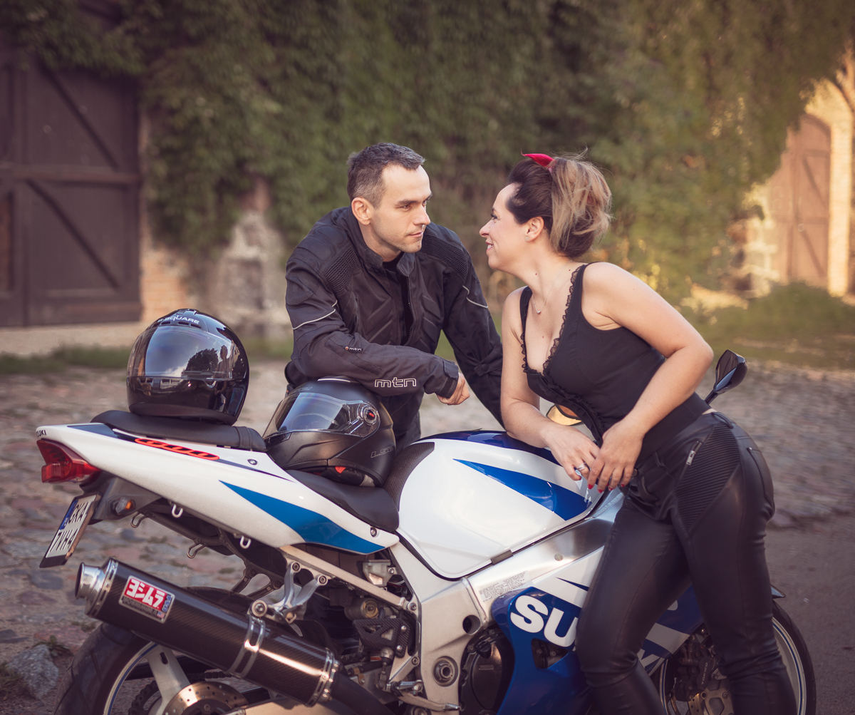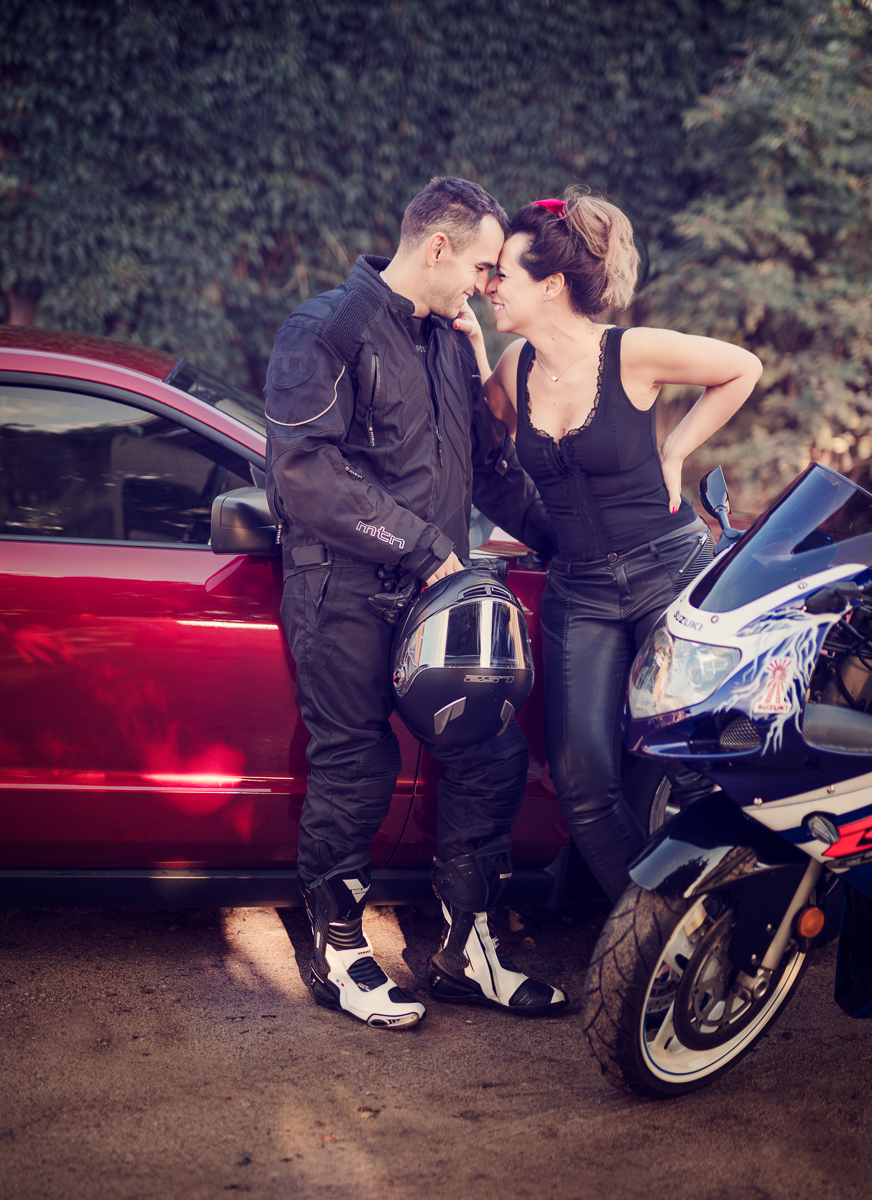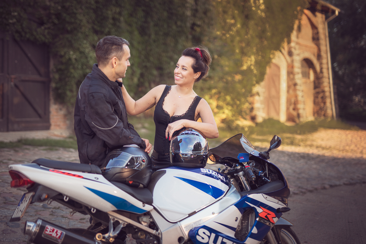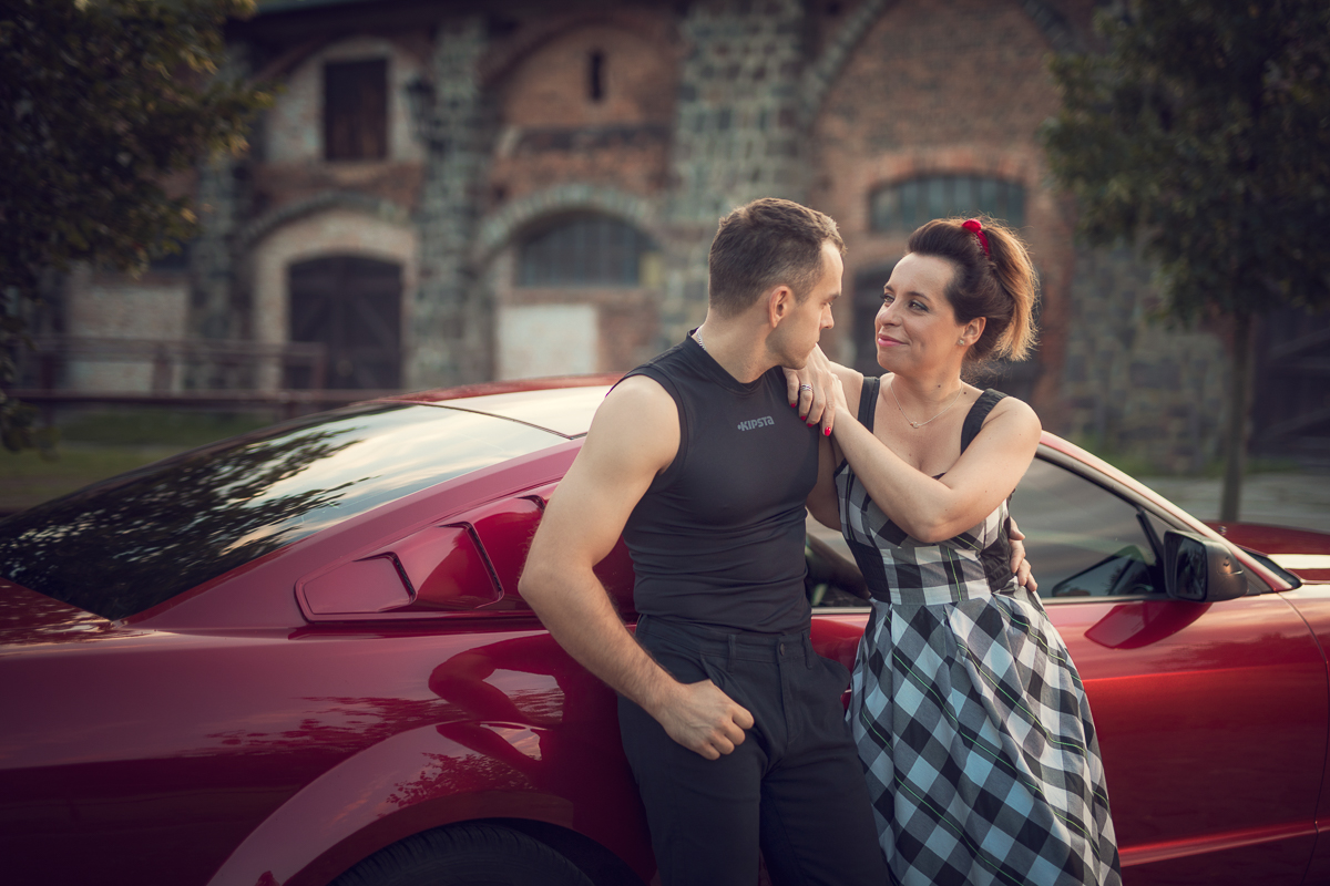 Agnieszka i Piotr marzyli o wspólnej sesji dla par. Ale wymarzyli sobie również, by na tych fotografiach pokazać dwie ogromne miłości Piotra (poza Agnieszką oczywiście) - motocykl i samochód. Wiedziałam o tym z kilku rozmów, jakie z nimi przeprowadziłam przed sesją. Aga zdradziła, że samochód to specjalnie szykowany na sesję piękny, czerwony Mustang a motocykl to ścigacz. Wiedziałam więc, że stylizacje trzeba będzie przygotować pod maszyny również, a także poszukać pleneru, który najlepiej podkreśli urodę samochodu, ale będzie również pasował do charakteru mojej Pary i spełniał ich oczekiwania. Padło na Kolibki w Gdyni, które stanowiły doskonałe tło zarówno dla Mustanga jak i motocykla. Umówiliśmy się tuż po wschodzie słońca. Lubię pracować w ciszy i pustej przestrzeni tak by modeli nic nie rozpraszało. Zależało mi, by pokazać te emocje, które są z Agą i Piotrem już od paru lat. Wyszło wspaniale, a para ma cudowną pamiątkę.
