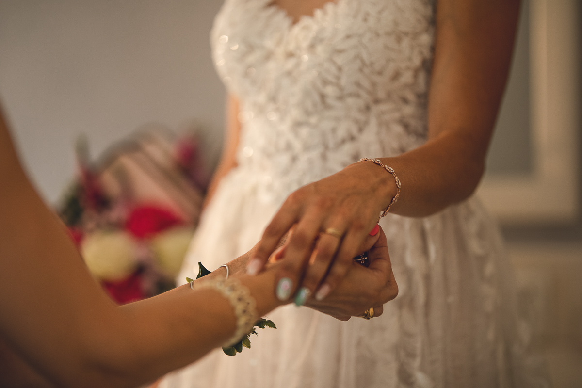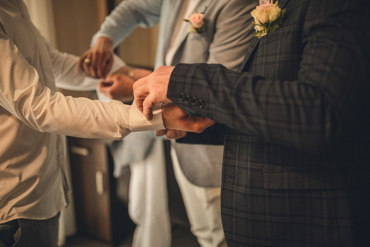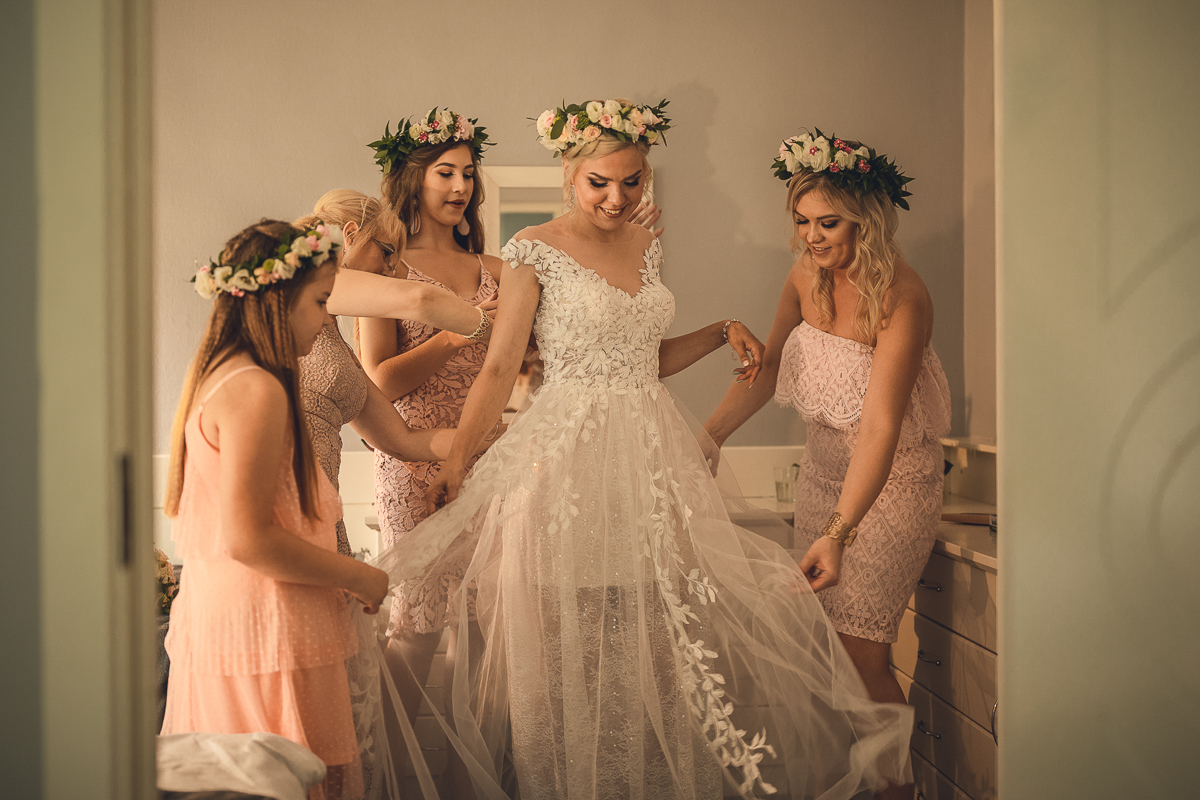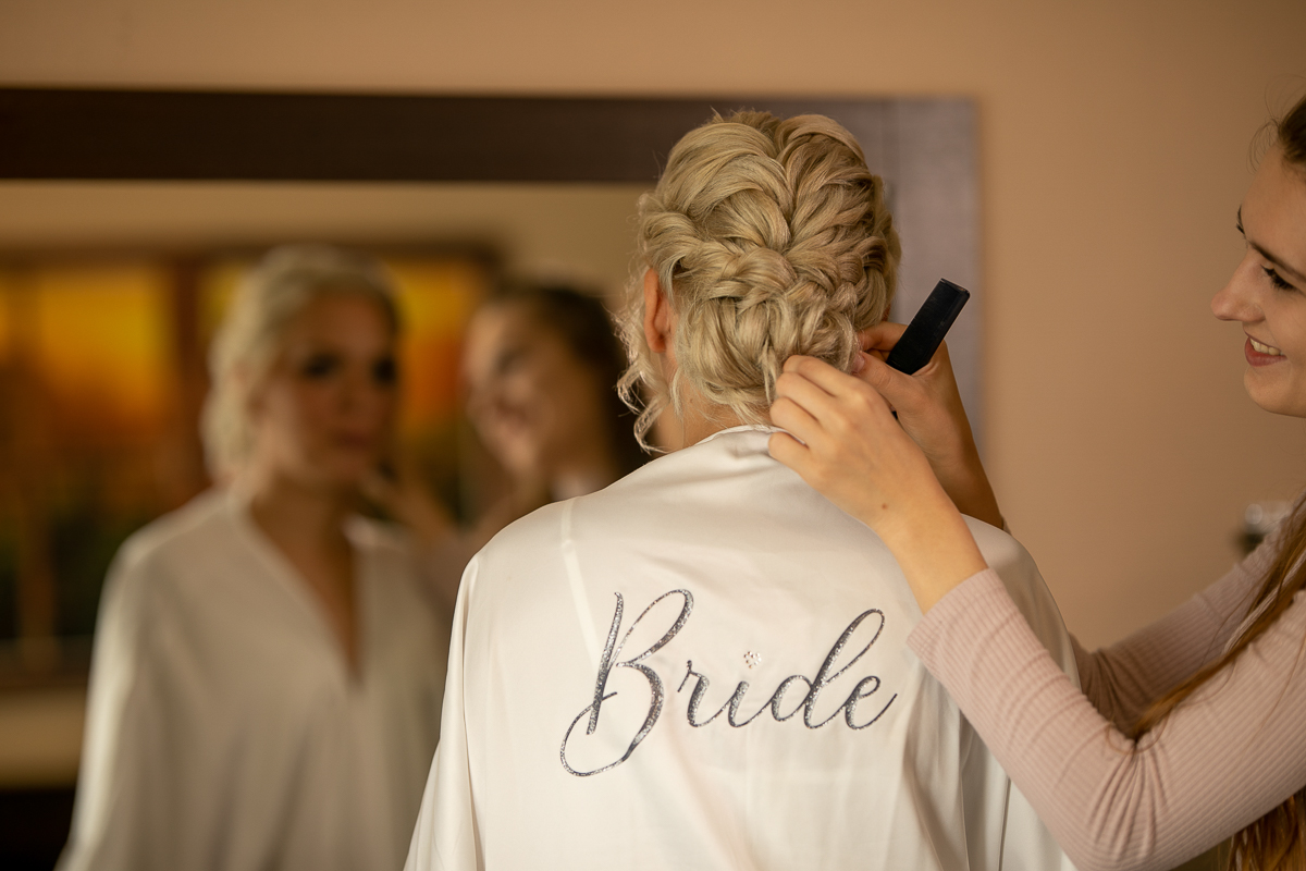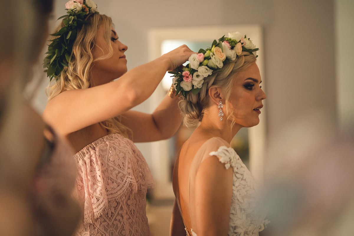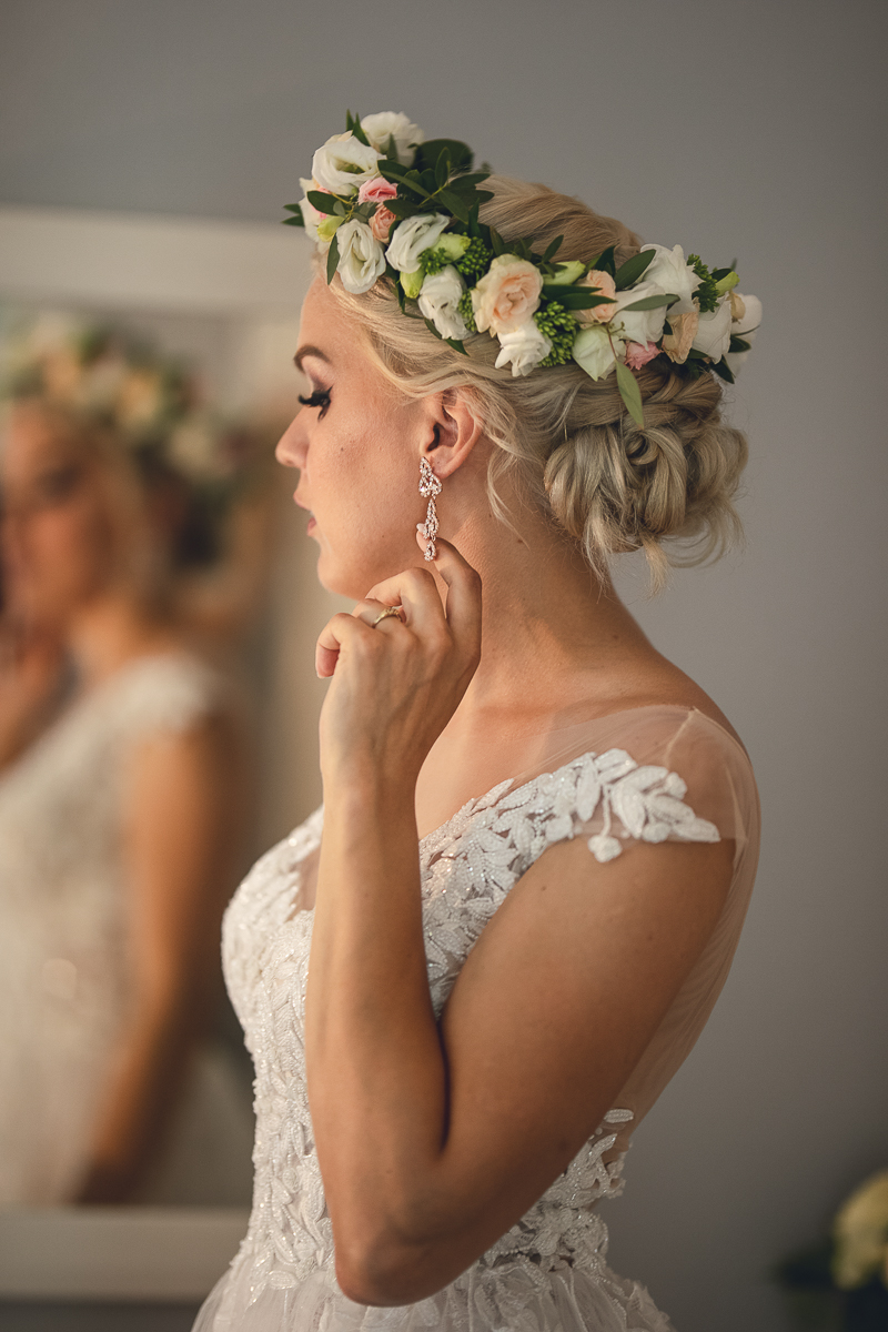 Następnie powrót do Hotelu, w którym Państwo Młodzi szykowali się do Ceremonii. Tradycyjnie - Panna Młoda wraz ze wszystkimi Paniami oraz Pan Młody w otoczeniu Panów. Ostatnie spojrzenie w lustro...