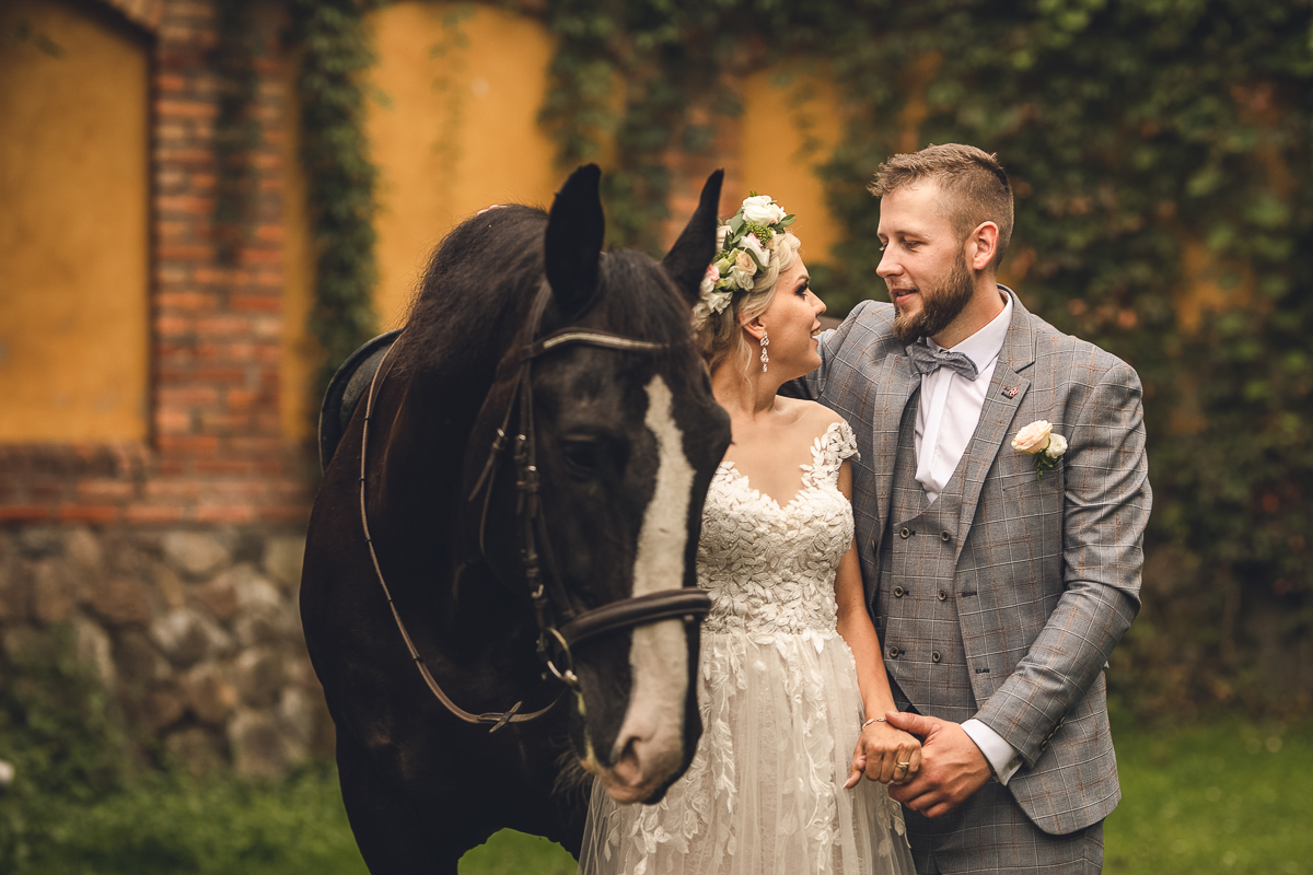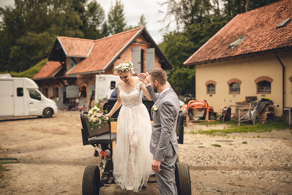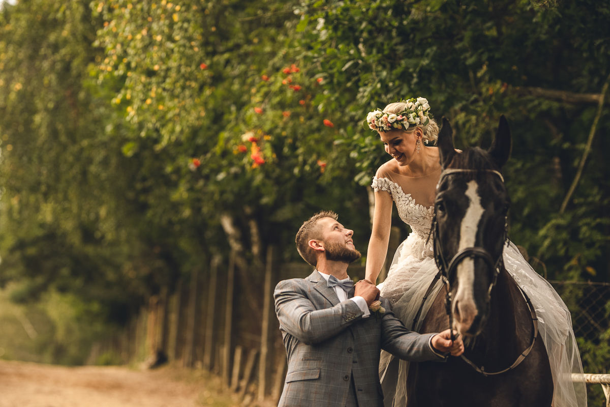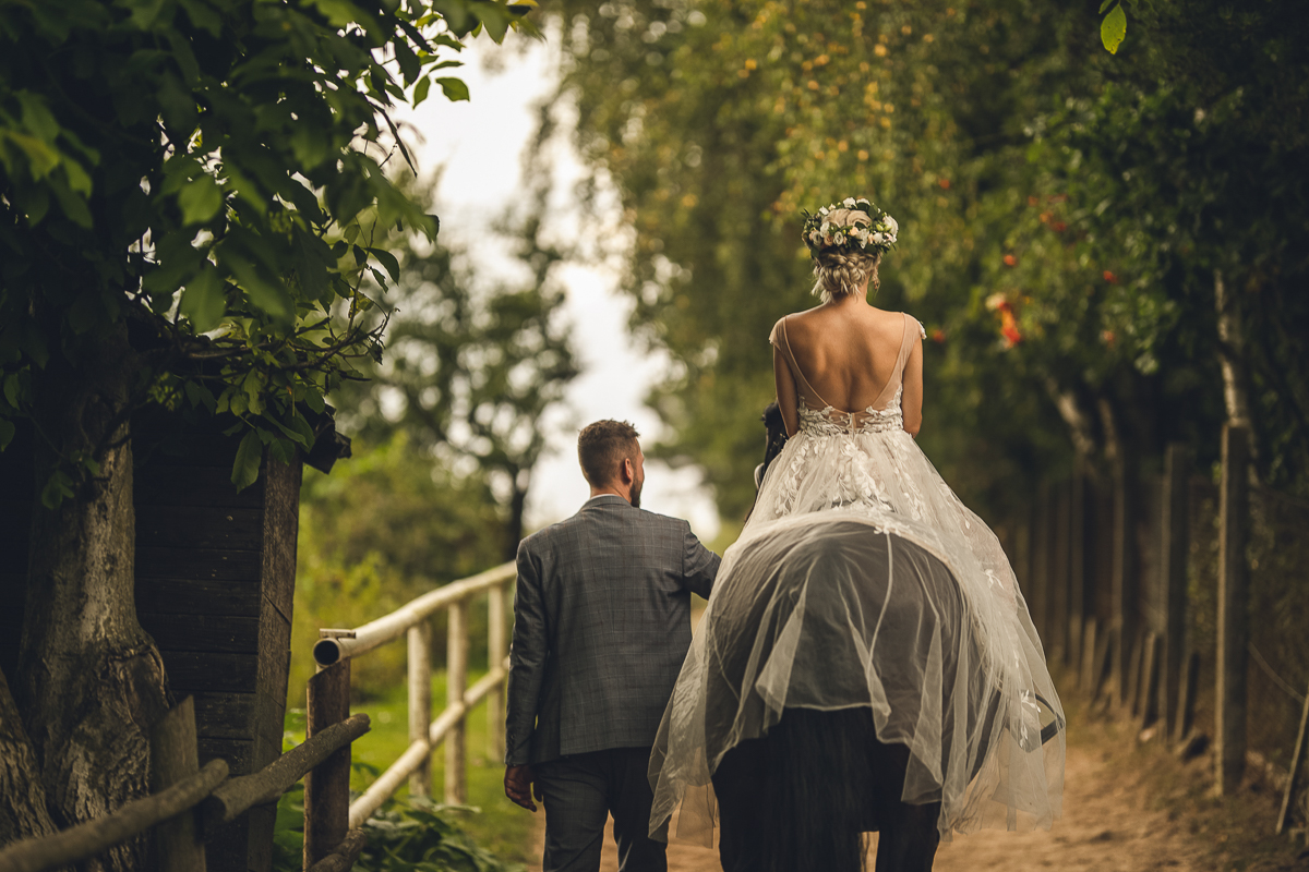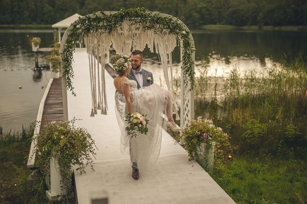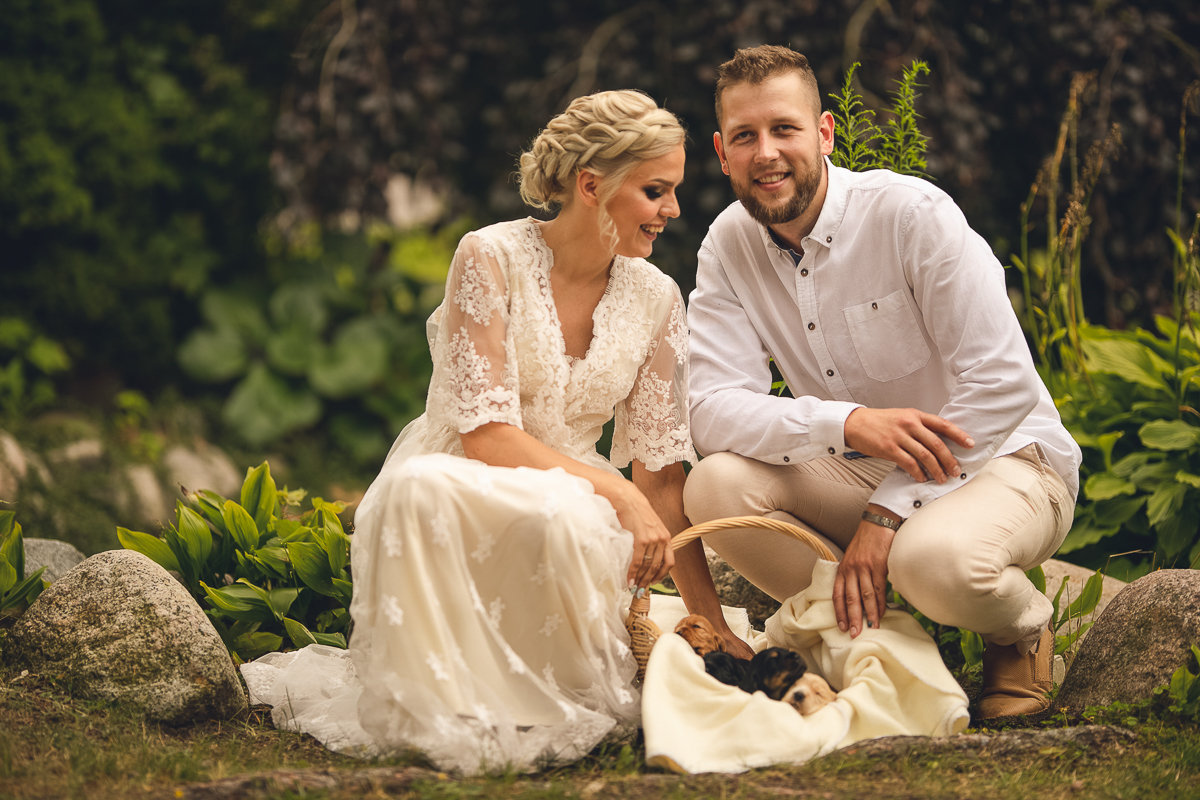 Zadzwoniła do mnie z prośbą uwiecznienia ich najważniejszego dnia w życiu, podkreślając, że ceremonia jest w plenerze i w poniedziałek. Akurat ten termin mieliśmy luźny, a plener znaliśmy doskonale, wiedzieliśmy więc, że ślub będzie jednym z piękniejszych, w których mieliśmy okazję brać udział. Nadszedł ten wielki dzień, dodatkowa trudność polegała na tym, że ślub odbywał się na przepięknym molo ślubnym nad Jeziorem Otomin, na terenie Hotelu Otomin, ale przyjęcie weselne i przejazd bryczkami zapewniała Stadnina i Restauracja Tabun. Zarówno ceremonia jak i cały wystrój zaplanowane zostały przez Agnieszkę w stylu boho. Para Młoda przyjechała na swój ślub z Wielkiej Brytanii, by w uroczystości mogła wziąć udział cała najbliższa Rodzina, a przede wszystkim ukochana Babcia Panny Młodej. Trzy tygodnie przed zaplanowaną ceremonią oszczeniła się suczka Państwa Młodych i podróżowali z Anglii w zestawie czterech dorosłych psów i dziewięciu cudownych maluchów...
