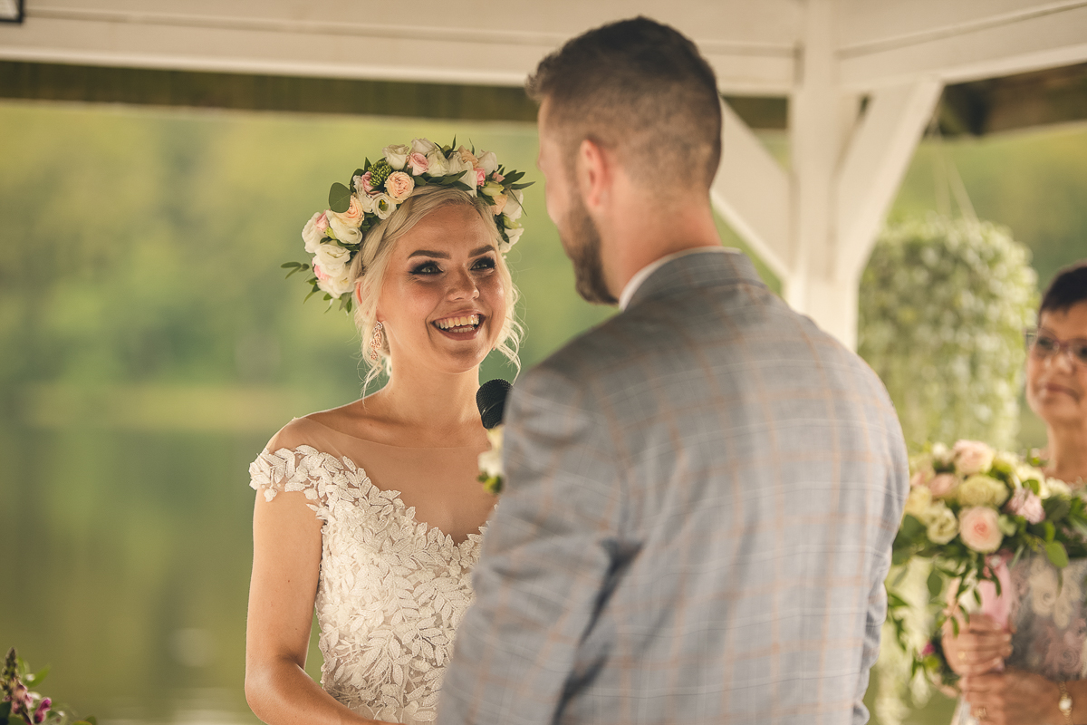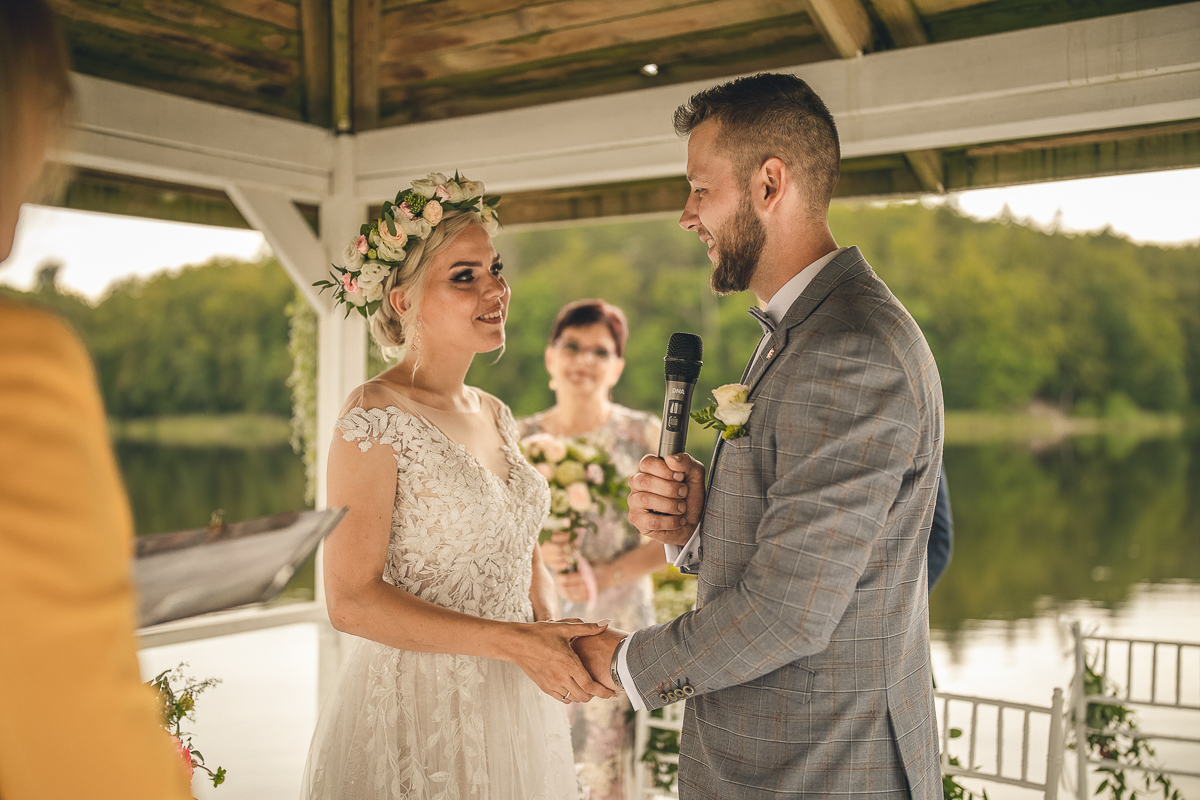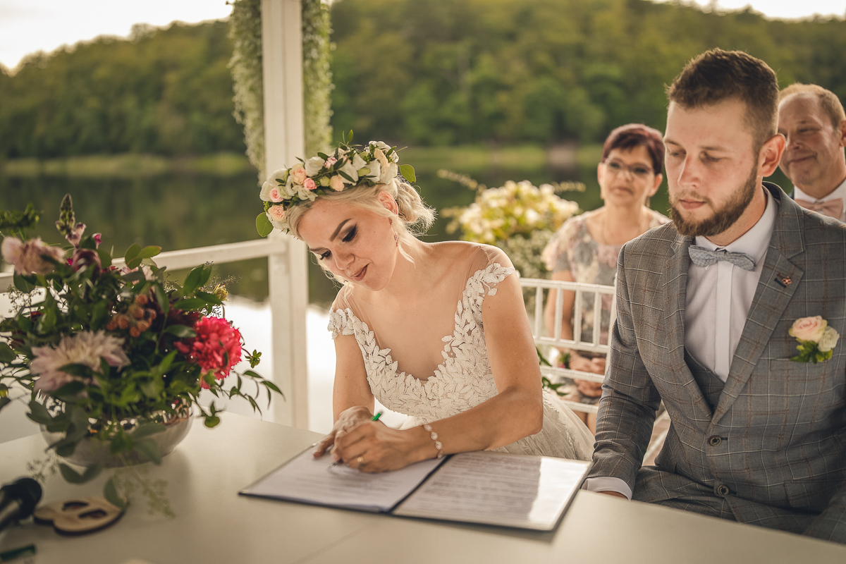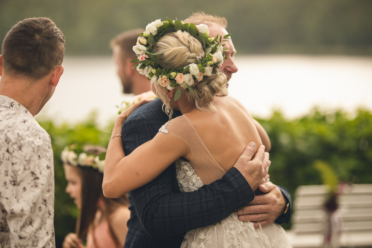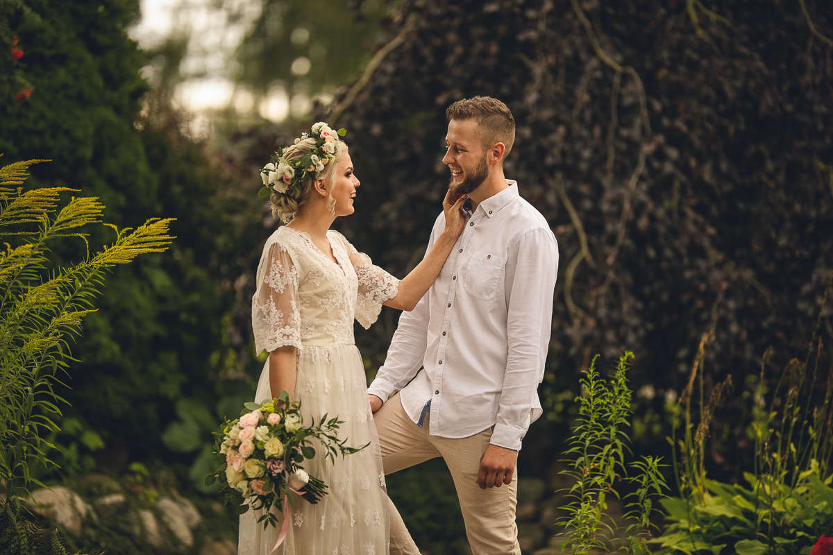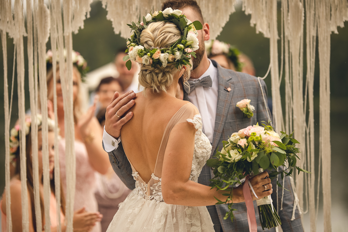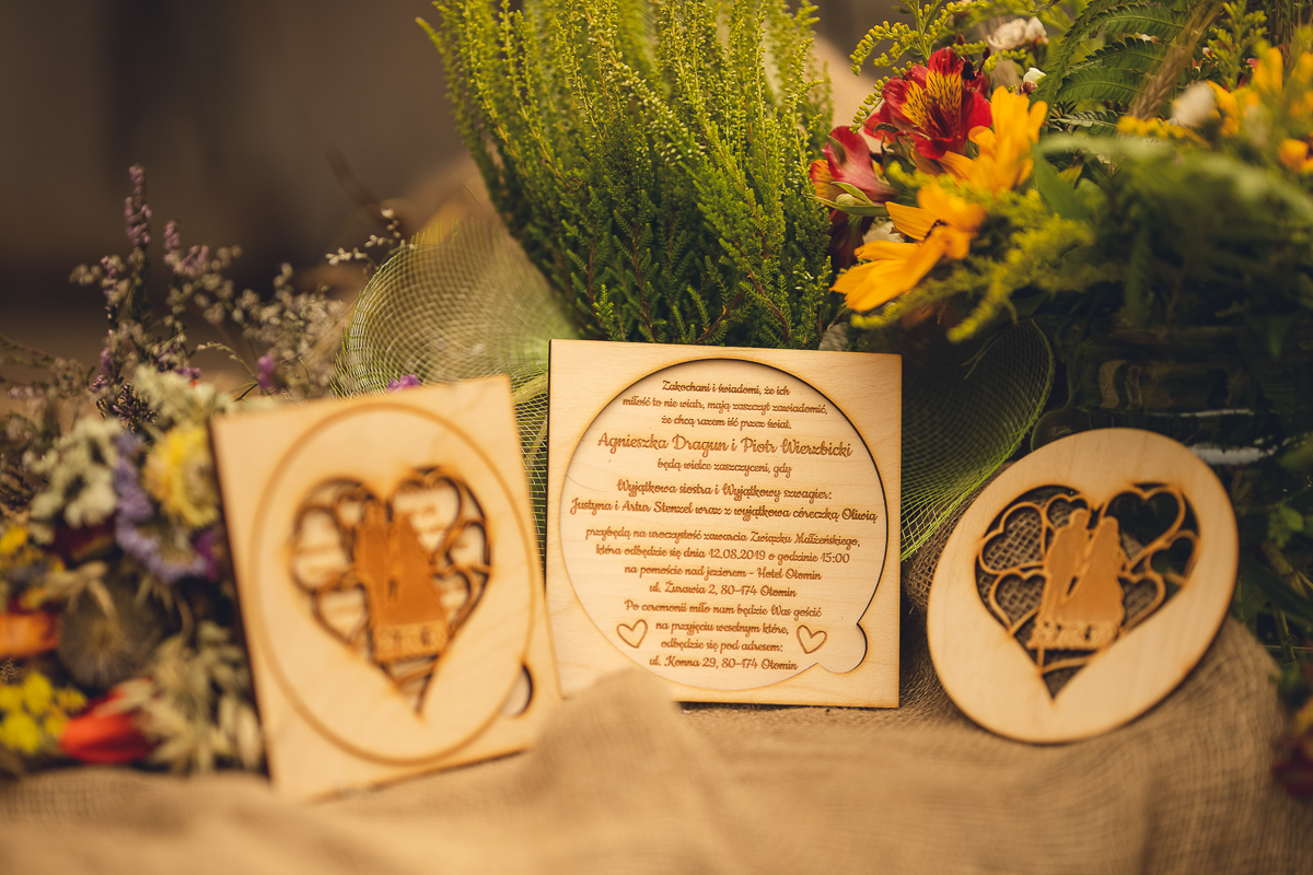 Zadzwoniła do mnie z prośbą uwiecznienia ich najważniejszego dnia w życiu, podkreślając, że ceremonia jest w plenerze i w poniedziałek. Akurat ten termin mieliśmy luźny, a plener znaliśmy doskonale, wiedzieliśmy więc, że ślub będzie jednym z piękniejszych, w których mieliśmy okazję brać udział. Nadszedł ten wielki dzień, dodatkowa trudność polegała na tym, że ślub odbywał się na przepięknym molo ślubnym nad Jeziorem Otomin, na terenie Hotelu Otomin, ale przyjęcie weselne i przejazd bryczkami zapewniała Stadnina i Restauracja Tabun. Zarówno ceremonia jak i cały wystrój zaplanowane zostały przez Agnieszkę w stylu boho. Para Młoda przyjechała na swój ślub z Wielkiej Brytanii, by w uroczystości mogła wziąć udział cała najbliższa Rodzina, a przede wszystkim ukochana Babcia Panny Młodej. Trzy tygodnie przed zaplanowaną ceremonią oszczeniła się suczka Państwa Młodych i podróżowali z Anglii w zestawie czterech dorosłych psów i dziewięciu cudownych maluchów...
