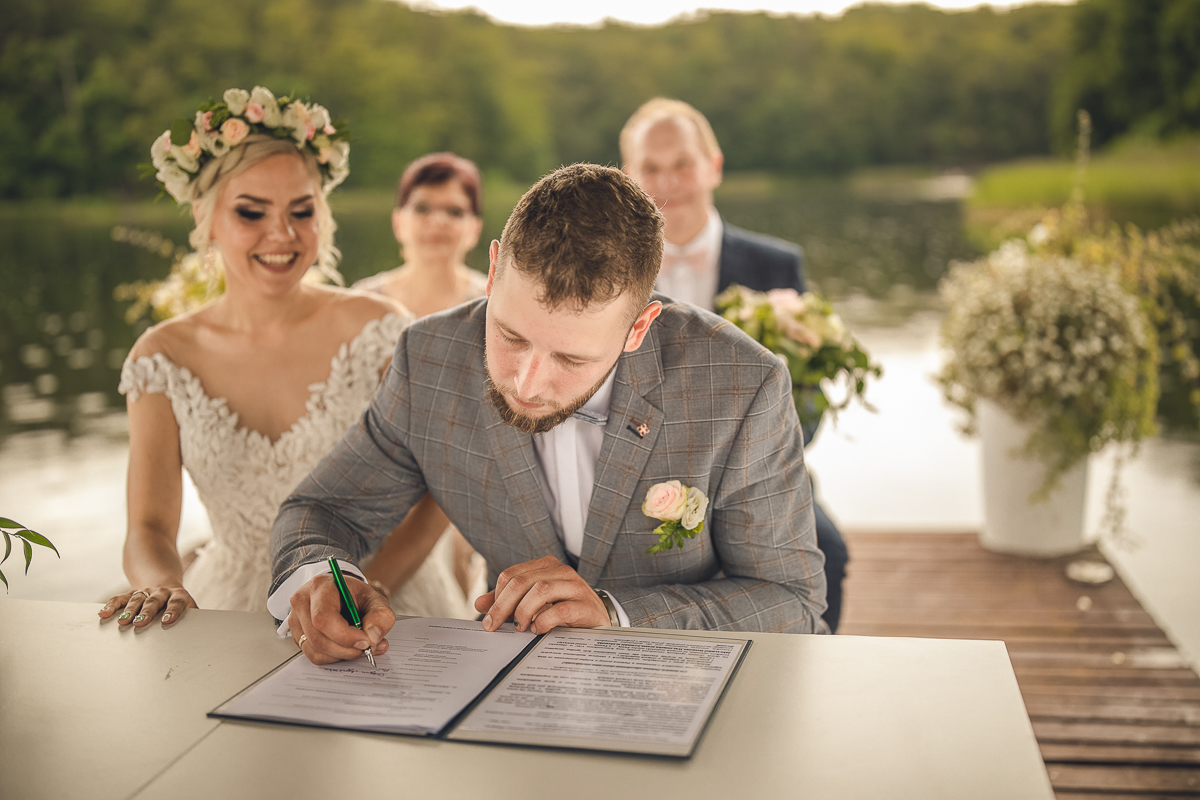 Pan Młody nie krył zachwytu widząc swoją Przyszłą Żonę w niezwykłej sukni, którą udało się ukryć przed wszystkimi do ostatniej sekundy, razem, dłoń w dłoń udali się w stronę molo, na którego końcu czekała już Pani Kierownik Urzędu Stanu Cywilnego w Gdańsku, by Młodej Parze udzielić ślubu.