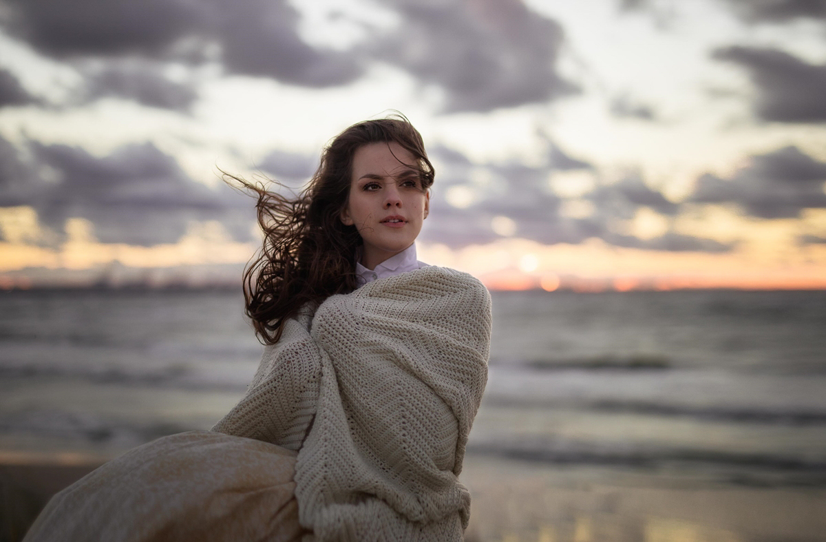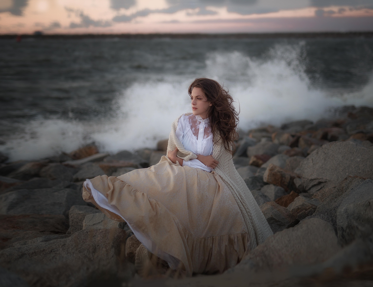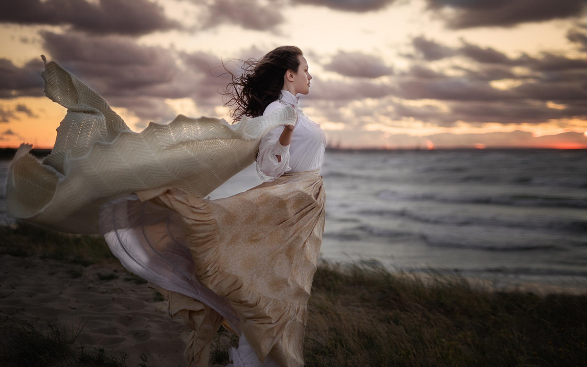 To był fantastyczny wieczór, umówiłam się z modelką na zachód słońca, który w tym dniu stał pod olbrzymim znakiem zapytania – potężny wiatr, sztorm na morzu i zbliżające się burzowe chmury. Zaczęłyśmy pod blokiem w stylizacji wiejskiej. Wcześniej przygotowany olbrzymi bukiet kwiatów doskonale komponował się ze złotymi trawami pól, zielenią drzew i błękitnym niebem. Upalne czerwcowe słońce grzało niemiłosiernie, ale niezrażona modelka dzielnie walczyła z wiatrem i upałem. Pod wieczór zaryzykowałyśmy wyjazd nad morze i to był strzał w dziesiątkę! Natura zrobiła nam tak cudowny prezent w postaci sztormowego nieba i rozbijających się fal o brzeg, że późniejsza praca nad zdjęciami sprowadziła się właściwie do rozjaśnienia twarzy i wyciągnięcia szczegółów stylizacji (z moich zasobów). Efekty możecie ocenić poniżej.
