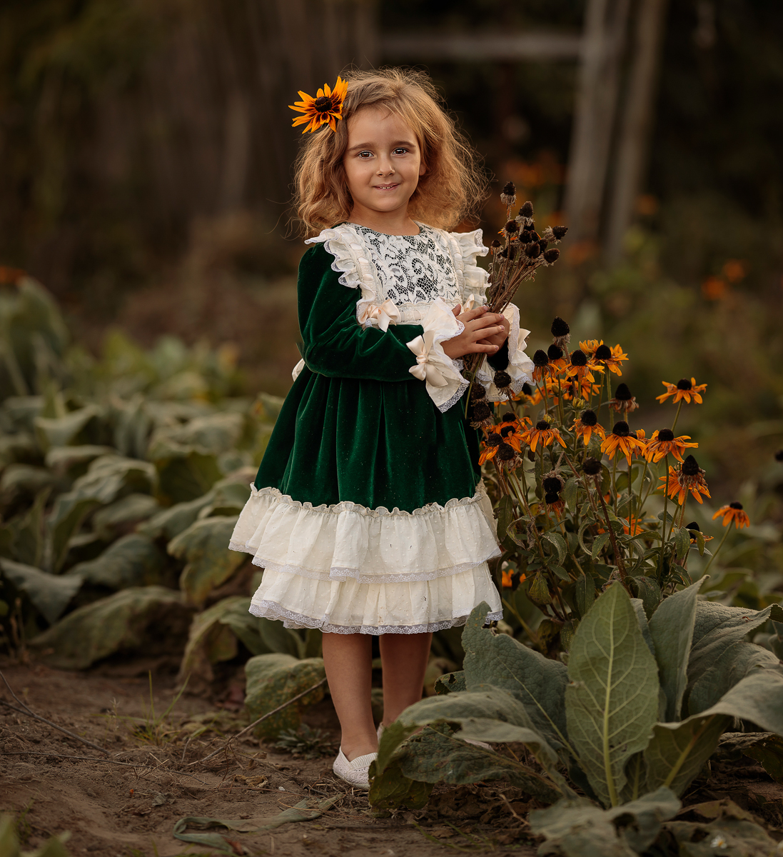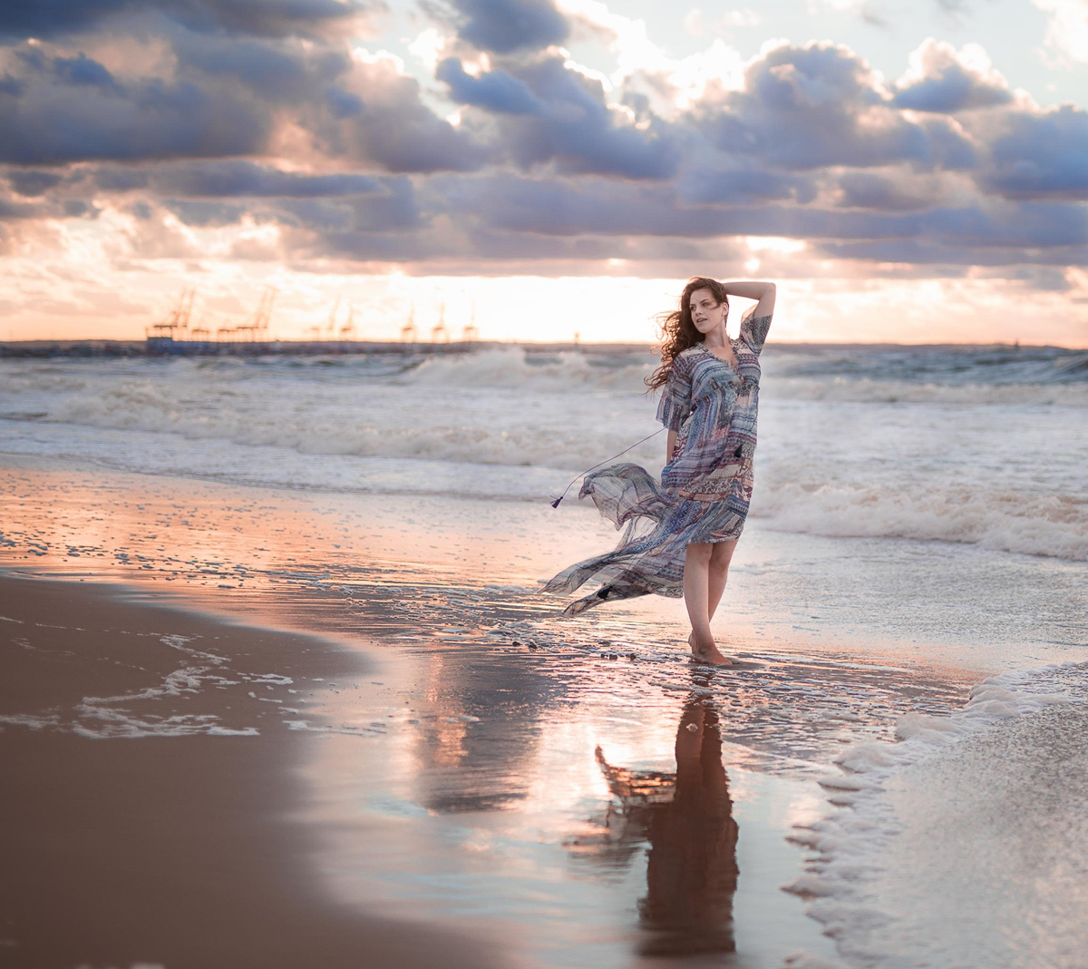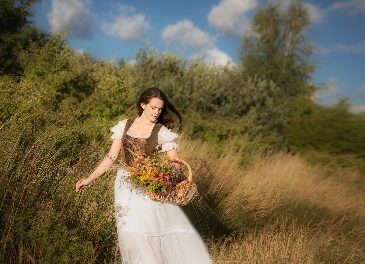 To był fantastyczny wieczór, umówiłam się z modelką na zachód słońca, który w tym dniu stał pod olbrzymim znakiem zapytania – potężny wiatr, sztorm na morzu i zbliżające się burzowe chmury. Zaczęłyśmy pod blokiem w stylizacji wiejskiej. Wcześniej przygotowany olbrzymi bukiet kwiatów doskonale komponował się ze złotymi trawami pól, zielenią drzew i błękitnym niebem. Upalne czerwcowe słońce grzało niemiłosiernie, ale niezrażona modelka dzielnie walczyła z wiatrem i upałem. Pod wieczór zaryzykowałyśmy wyjazd nad morze i to był strzał w dziesiątkę! Natura zrobiła nam tak cudowny prezent w postaci sztormowego nieba i rozbijających się fal o brzeg, że późniejsza praca nad zdjęciami sprowadziła się właściwie do rozjaśnienia twarzy i wyciągnięcia szczegółów stylizacji (z moich zasobów). Efekty możecie ocenić poniżej.