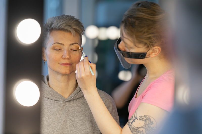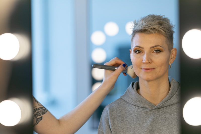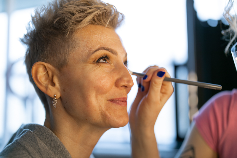 Jowita to młodziutka, niezwykle utalentowana artystka. Na codzień pracuje w MAC Cosmetics jako wizażystka, w weekendy zamienia zwyczajne, zapracowane kobietki w gwiazdy. Tak było i tym razem. Karolina wprawdzie uśmiechnięta, ale i nieco zdenerwowana i spięta zasiadła na fotelu by oddać się w ręce naszej fantastycznej stylistce makijażu. Z ogromną przyjemnością przyglądałam się procesowi i jednocześnie fotografowałam postępy.