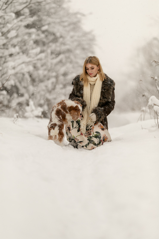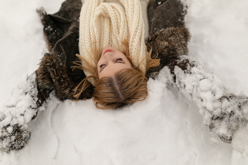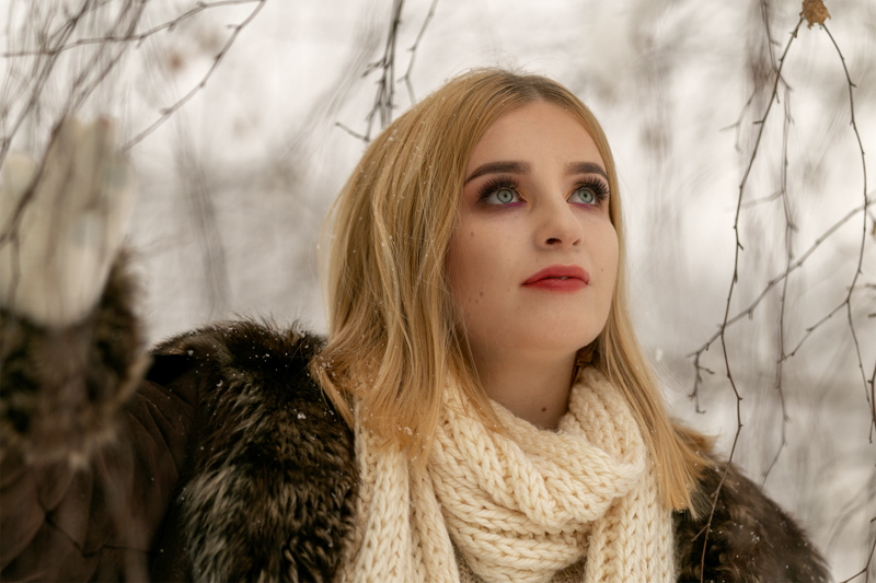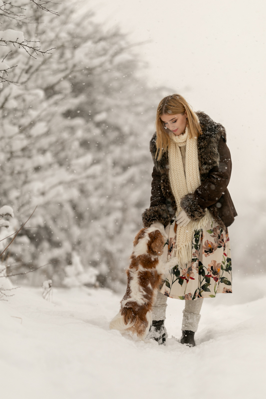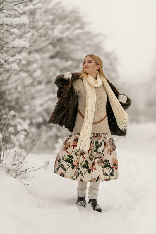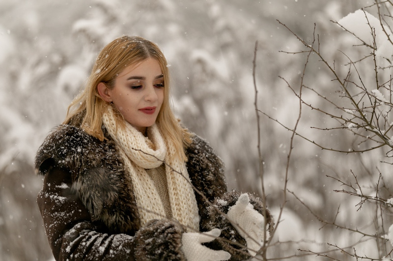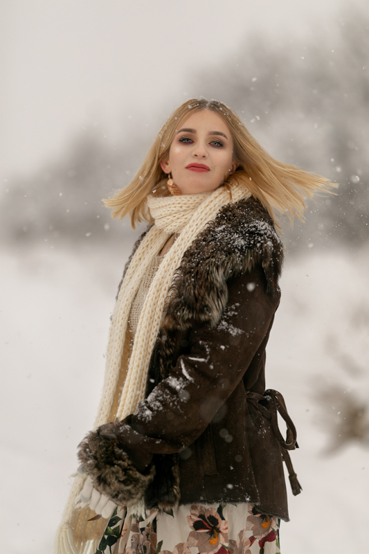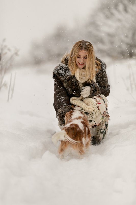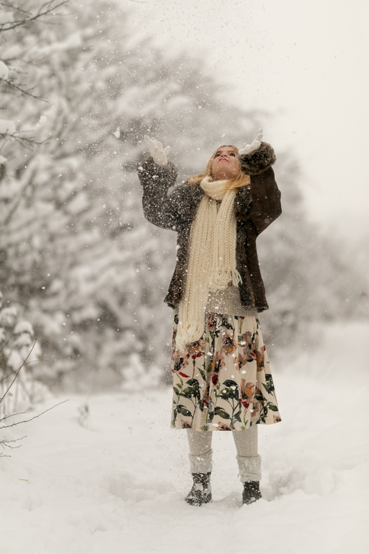 Śnieg padał coraz bardziej obficie i po 40 minutach, kilku portretach i spacerku po ośnieżonej ścieżce szybko wracałyśmy otrzepać się ze śniegu. Monika zamieniła spódnicę na spodnie i pobiegłyśmy zrobić orzełka na śniegu. Dosłowne pięć minut zabawy skończyło się piętnastoma minutami wzajemnego odśnieżania. Opady były tak obfite, że Monika musiała poczekać, aż się trochę rozjaśni. Skorzystałam z okazji i pokazałam jej efekty sesji. Szybko zdecydowała się na zdjęcia – i oto są.