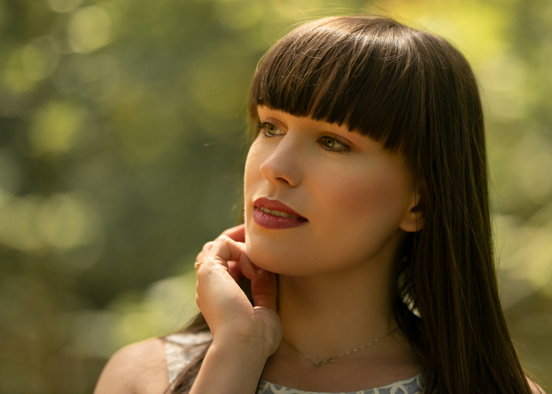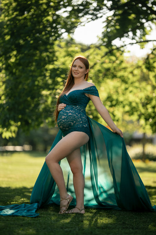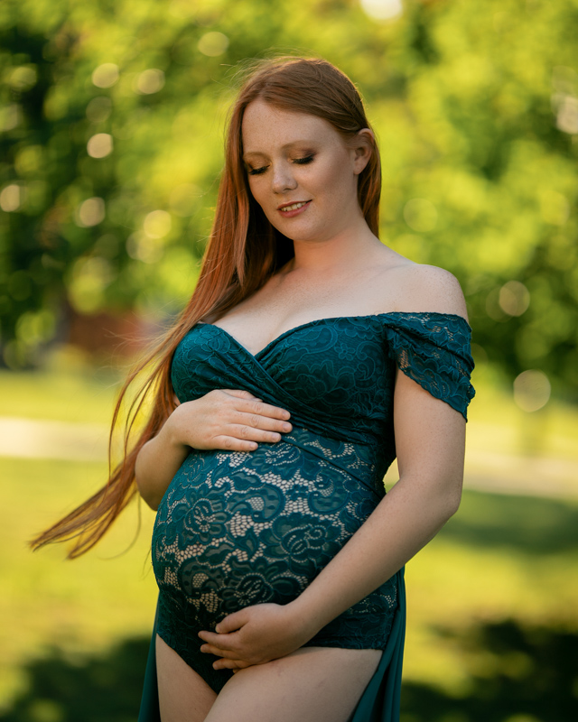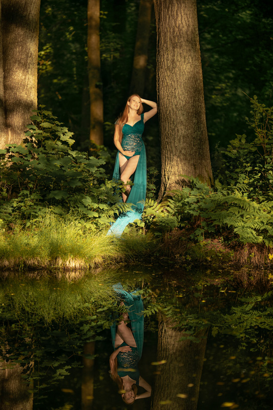 Chciałam pokazać przede wszystkim Magdę i jej emocje, skorzystałam zatem z sukienek ze swojej garderoby, które genialnie wydobyły rudość jej włosów, otaczającą nas zieleń i światło. Wróciłam z ogromnym sentymentem do pięknego koronkowego body w kolorze butelkowej zieleni, które razem z szyfonowym szalem wystylizowały Przyszłą Mamę na nimfę leśną.