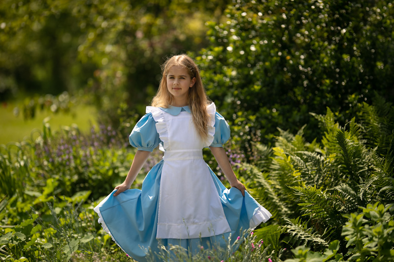 Już przy pierwszej wizycie, gdy tylko Lilly wyszła z domu, zobaczyłam „moją” Alicję w Krainie Czarów. Sukienka od Wioli Barry czekała właśnie na nią. Wprawdzie bez królika, ale za to w zaczarowanym ogrodzie, Lilly jako Alicja.