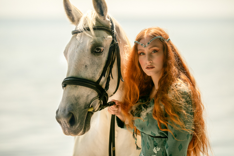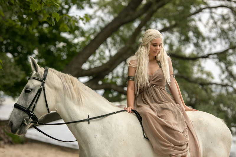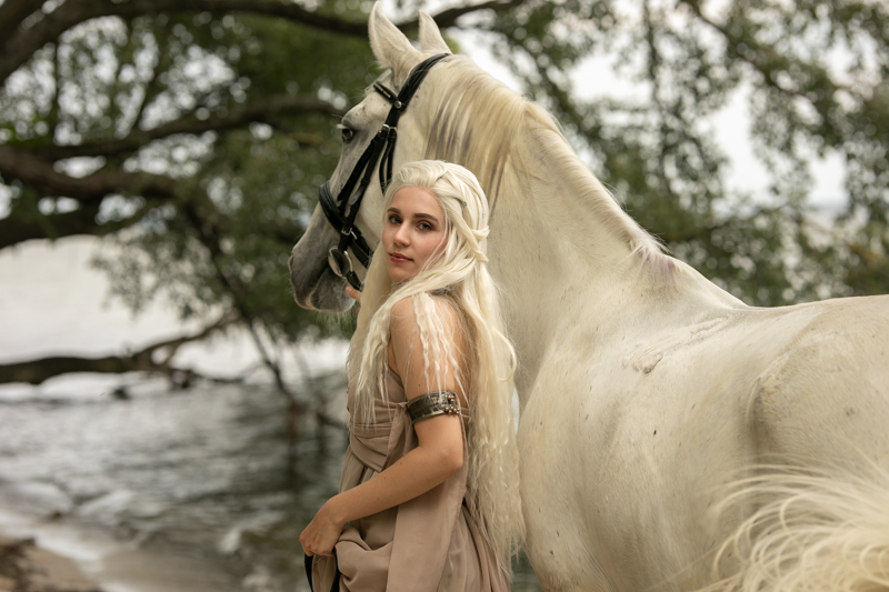 Pomyślałam też o koniu. Ukochana, wspaniała Srebrzysta – podarunek ślubny od Khala. W Srebrzystą wcieliły się dwie klacze rasy Lipican ze stajni Zamek nad Morzem (Rzucewo) – Perła i Fanni. Dominika po raz pierwszy siedziała na koniu. Bez siodła, na oklep – jak najbardziej naturalnie, na bosaka. To naprawdę było wyzwanie, zwłaszcza, gdy zdaliśmy sobie sprawę, że klej peruki Daenerys odstraszał konie, które za nic nie chciały zbliżyć się do naszej modelki. Zatem proszę, doceńcie kadry, które powstały pomimo zniecierpliwienia tych pięknych zwierząt.