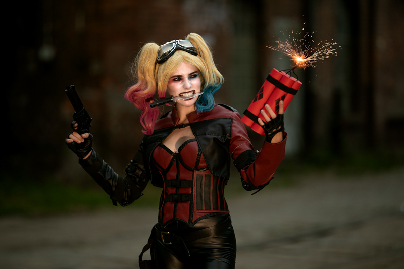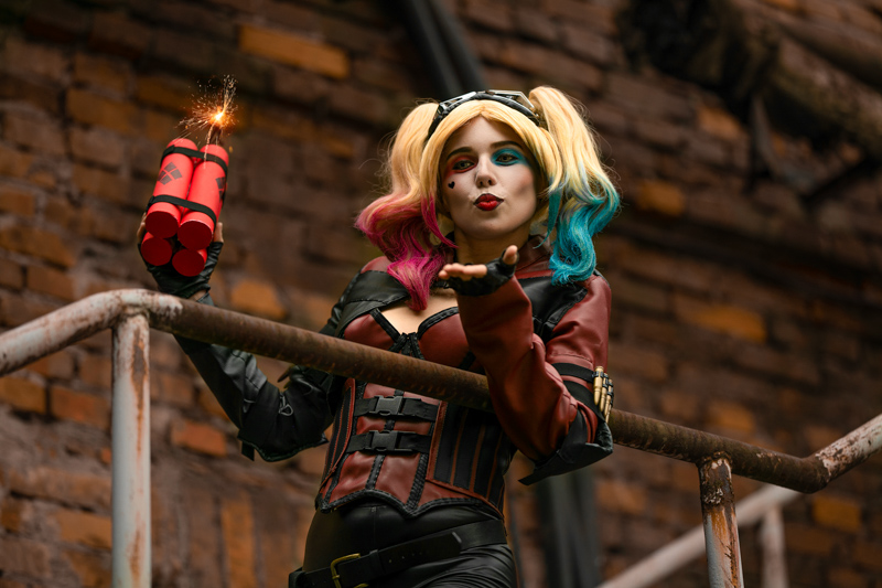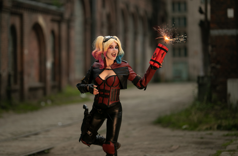 Och co to jest za Cosplay! Jak tylko obejrzałam „Legion Samobójców” na początku tego roku, wiedziałam, że chcę mieć Ją w portfolio. Szalona, psychodeliczna, słodka morderczyni bez skrupułów. Oksymoron, wiem, ale cóż, taka jest Harley. Do tego te stylizacje, słodka buzia i giwera albo kij bejsbolowy. Dominika przywiozła ze sobą dwie wersje Harley – wersję z gry, którą postanowiliśmy focić na terenie Stoczni Cesarskiej oraz wersję z „Ptaków Nocy”, najnowszego filmu Christiana Hodsona. I tego cudownie kolorowego „ptaka” postanowiliśmy uwieczniać wieczorem, na tle wystaw nocnego, rozświetlonego Forum. To oznaczało, że nasza Modelka znowu będzie musiała zmieniać charakteryzację i przebierać się. Zobaczcie, warto było.