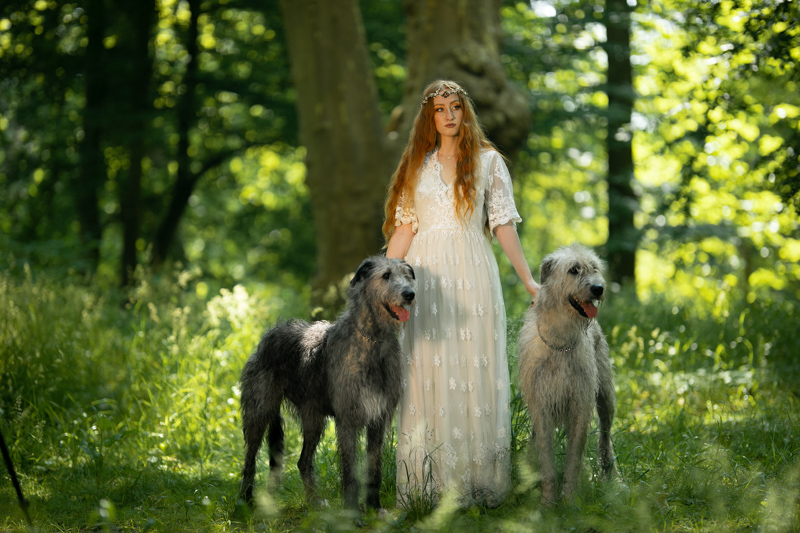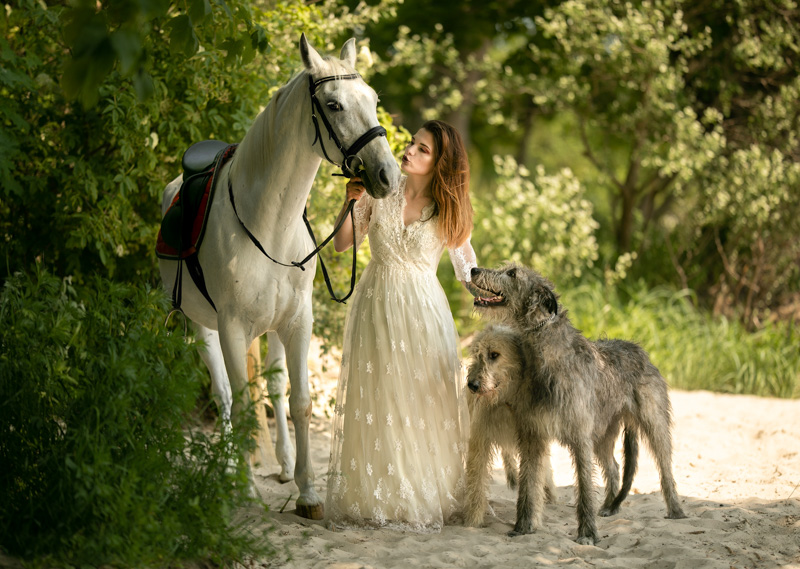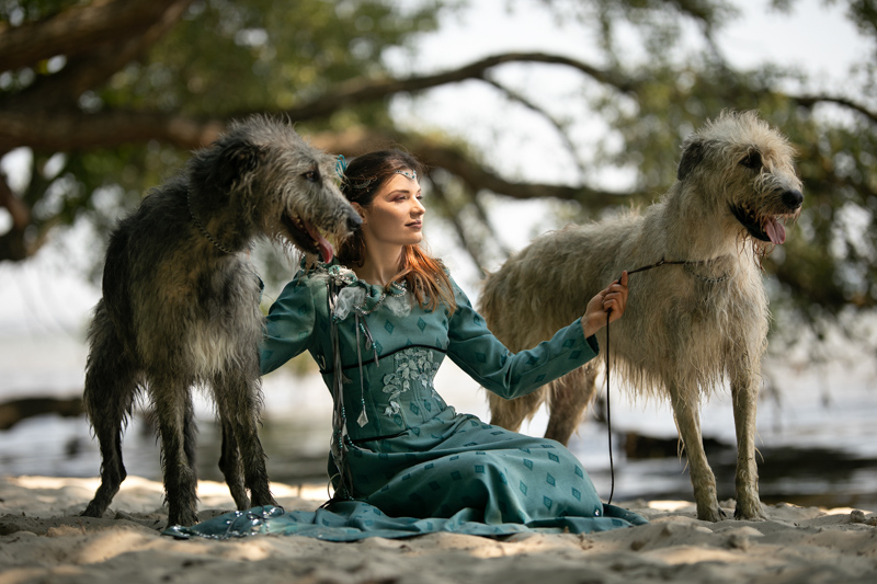Pierwotny projekt zakładał udział Basi i jej wilczarzy (tylko). Wpadłam na szalony pomysł, że z wilczarzami pięknie zgrałby się koń. WOW, wyzwanie modelka + dwa ogromne psy + koń. Nie do ogarnięcia? No czemu nie. Pomysł ewaluował. W międzyczasie nawiązaliśmy współpracę z cudowną Magdaleną Pająk, czyli Arachne Craft, autorką i projektantką wspaniałych stylizacji w stylu fantasy. Gdy tylko zaprezentowałam temat przewodni, natychmiast podrzuciła mi propozycje stylizacji, które mogłyby pasować do mojej wizji. Umówmy się, wizji która dopiero zaczęła się kształtować.