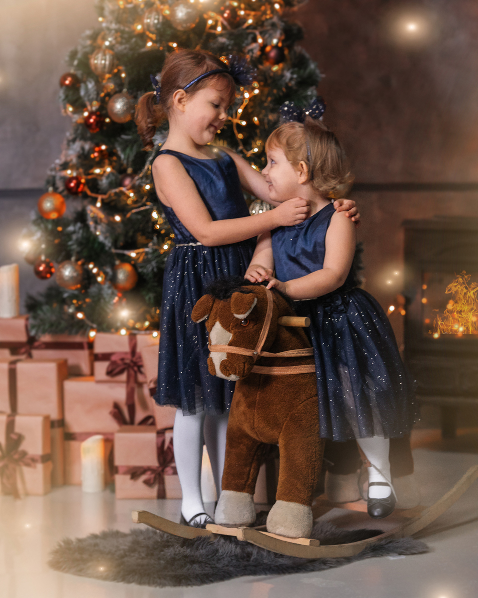 Trudno o indywidualizm, jeśli korzysta się z gościnności ogólnie dostępnego studio, jak na przykład Shipyard Studio. Ale zawsze można spróbować "rozpalić" w kominku lub przynieść ze sobą własne rekwizyty. Poniżej na zdjęciu Zosia i Oliwka na foto baśniowym koniku.